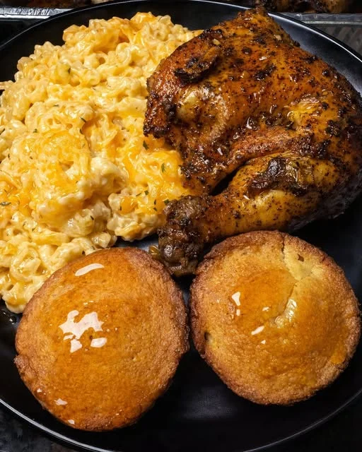 This comforting Southern-style meal features juicy seasoned baked chicken served alongside rich, creamy mac and cheese and warm cornbread. It’s a satisfying plate of crispy, creamy, and savory flavors that’s perfect for family dinners or weekend comfort food.