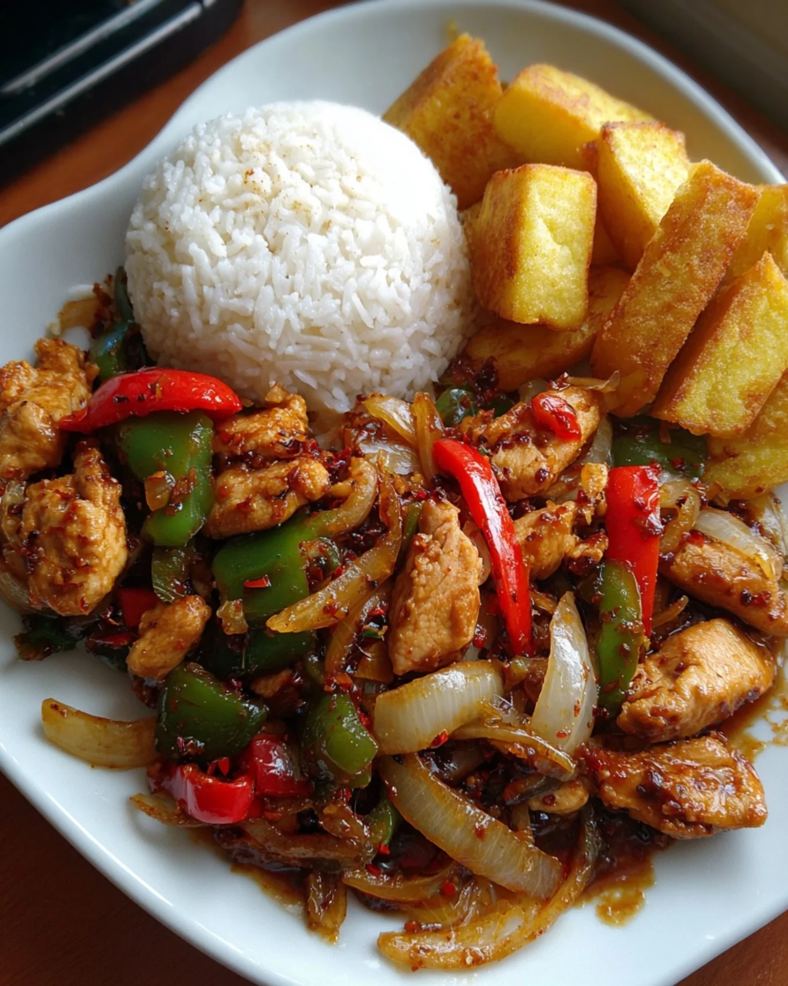 Spicy Stir-Fried Chicken with Peppers, Rice & Fried Plantains is a bold and flavorful dish that combines tender chicken, vibrant bell peppers, and a fiery sauce, all served with fluffy white rice and crispy golden plantains. It’s a delicious fusion of heat, sweetness, and savoriness on one plate.