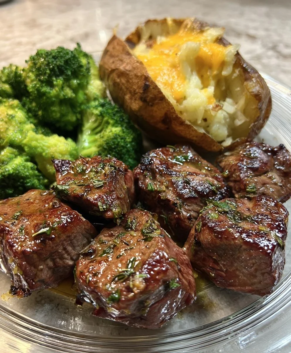 This hearty and satisfying meal features juicy, herb-garlic steak bites paired with a cheesy loaded baked potato and perfectly steamed broccoli. It’s a comforting dinner that’s packed with flavor and nutrition, perfect for a weeknight treat or a special occasion.