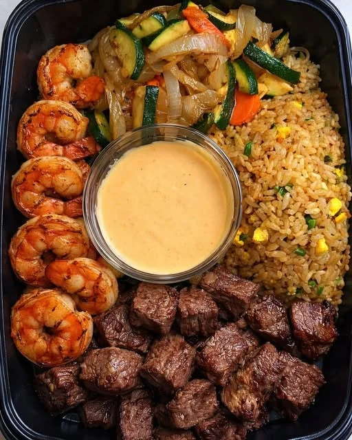 This steak and shrimp fried rice combo is a flavorful takeout-style meal loaded with juicy seared steak bites, garlic butter shrimp, vegetable stir-fry, and savory egg fried rice. Finished with a creamy yum-yum style sauce, this dish delivers the perfect balance of protein, vegetables, and bold Asian-inspired flavors in one satisfying bowl.