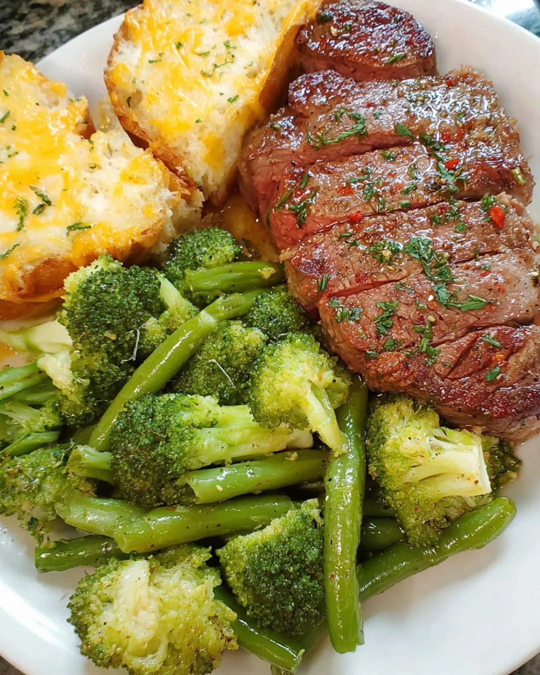 This classic steak dinner pairs a juicy, seared steak with vibrant sautéed broccoli and green beans. Perfect for a satisfying yet balanced dinner, this dish brings together protein, greens, and a side of cheesy garlic bread for extra indulgence. It’s easy enough for a weeknight and elegant enough for a special occasion.