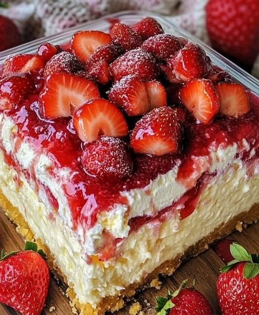 This Strawberry Cheesecake is a showstopper dessert that’s both rich and refreshing. It starts with a buttery graham cracker crust, layered with velvety cheesecake filling, fluffy whipped topping, and a generous crown of juicy strawberries and strawberry glaze. Perfect for holidays, gatherings, or any time you need an irresistible treat.