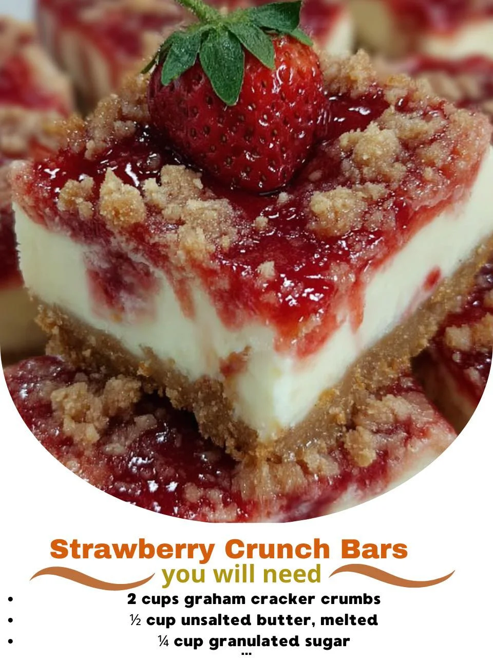 These Strawberry Crunch Bars are a creamy, fruity, and delightfully crunchy dessert that combines the richness of a cheesecake bar with the bright, summery flavor of strawberries. With a buttery graham cracker crust, a smooth cream cheese filling, a swirl of strawberry preserves, and a streusel topping, they’re perfect for potlucks, picnics, or sweet cravings any time of year.