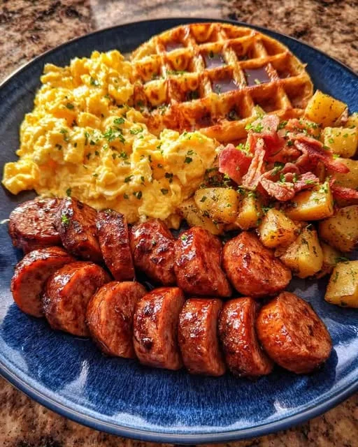 A hearty brunch favorite that brings together sweet and savory flavors on one plate. Crispy golden waffles, fluffy scrambled eggs, savory sausage slices, and seasoned breakfast potatoes make this dish the perfect comforting start to a relaxed Sunday morning.