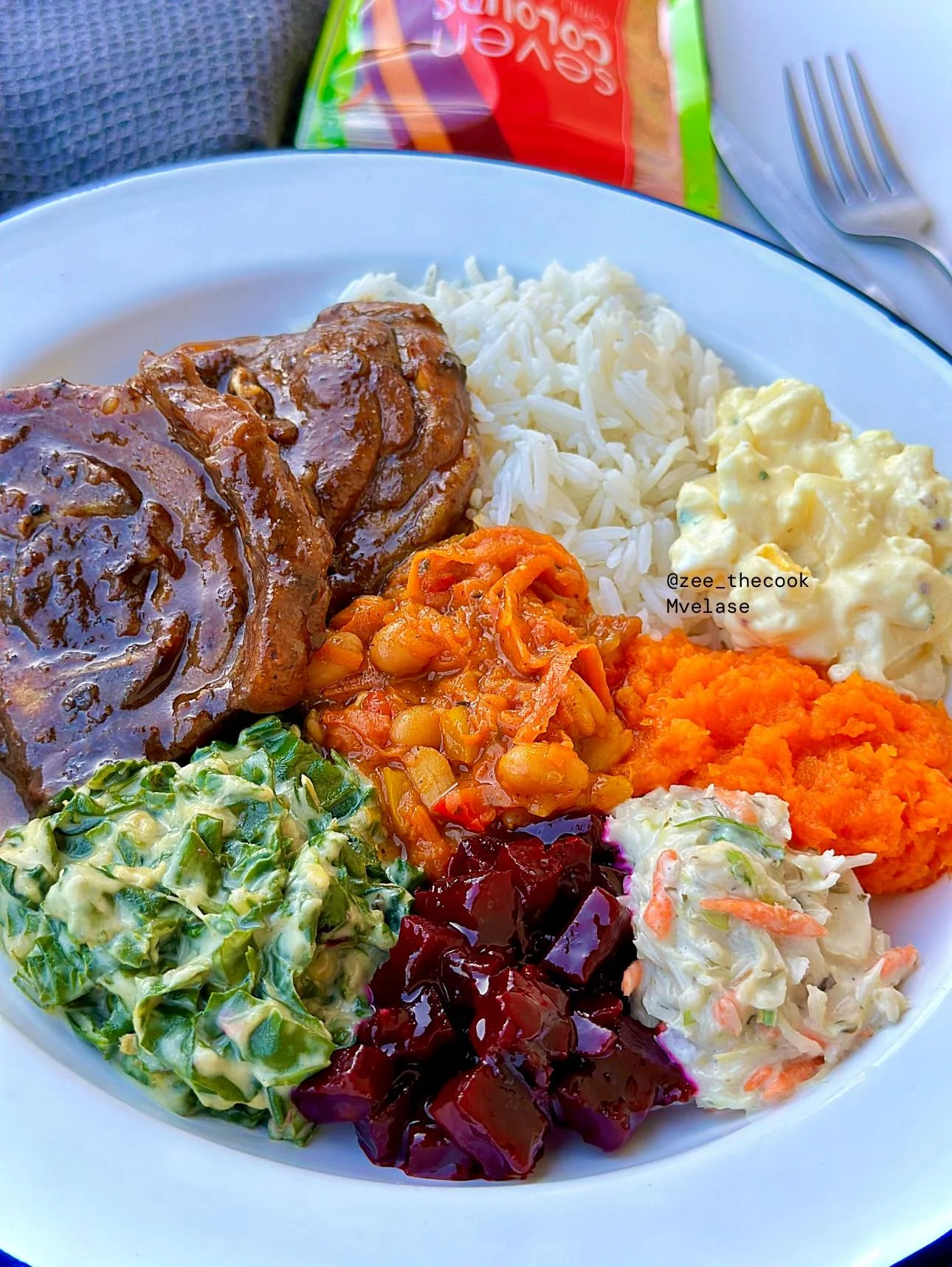 This colorful and comforting Sunday plate brings together tender roast beef in rich gravy with a vibrant medley of classic South African sides: creamy spinach, chakalaka, mashed butternut, potato salad, beetroot salad, coleslaw, and fluffy white rice. It’s a soulful meal perfect for a family gathering or celebration.