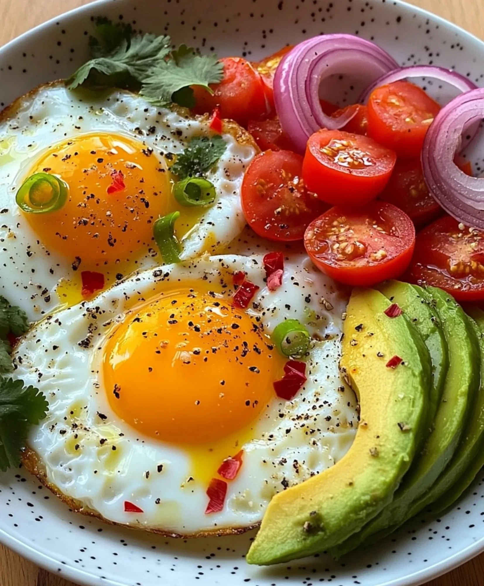 Start your day energized and nourished with this Sunny Egg & Avocado Power Plate. Featuring perfectly cooked sunny-side-up eggs, creamy avocado slices, juicy cherry tomatoes, crisp red onions, and fresh herbs, this breakfast or brunch dish is packed with color, nutrients, and flavor. Quick to make and beautifully balanced, it’s a wholesome way to fuel your morning.