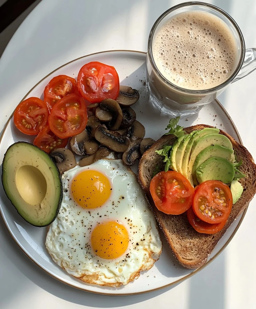 Start your morning with this energizing and nutrient-packed sunny protein breakfast. It features perfectly cooked sunny-side-up eggs, sautéed mushrooms, fresh veggies, creamy avocado toast, and a warm, frothy latte—ideal for a balanced and satisfying start to the day.