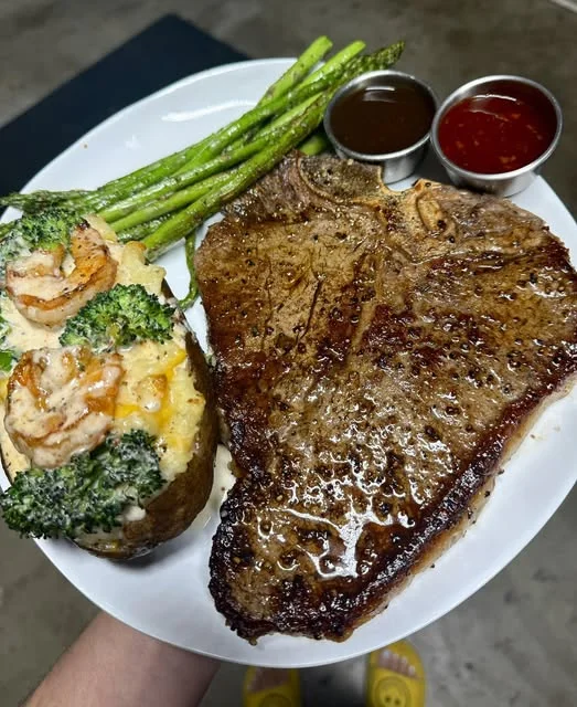 This T‑Bone Steak, Asparagus & Shrimp Alfredo Potato is a restaurant‑style dinner plate packed with bold flavors and satisfying textures. A perfectly seared T‑bone steak is paired with tender asparagus and a loaded baked potato topped with creamy shrimp Alfredo and broccoli for a rich and comforting meal.