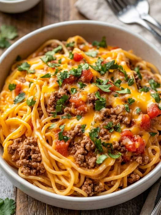 A delicious fusion of classic Italian pasta and bold Mexican taco flavors, Taco Spaghetti is a comforting, cheesy, and savory dish perfect for busy weeknights or family dinners.