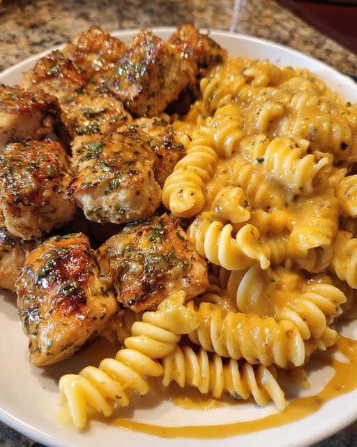 This creamy and flavorful dish combines juicy garlic butter chicken with tender rotini pasta coated in a rich three-cheese sauce. It’s a comforting, satisfying meal perfect for weeknight dinners or special occasions.