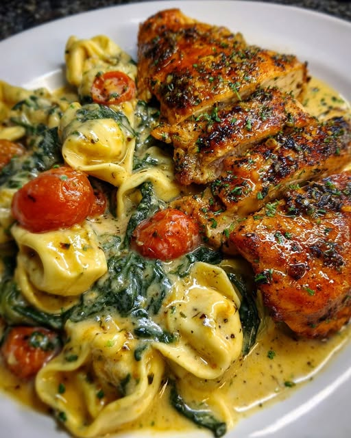 This Tuscan chicken with creamy spinach tortellini is a rich and flavorful dish featuring juicy, seasoned chicken served with tender cheese-filled pasta in a creamy garlic sauce with spinach and tomatoes. It’s a comforting, restaurant-quality meal made at home.