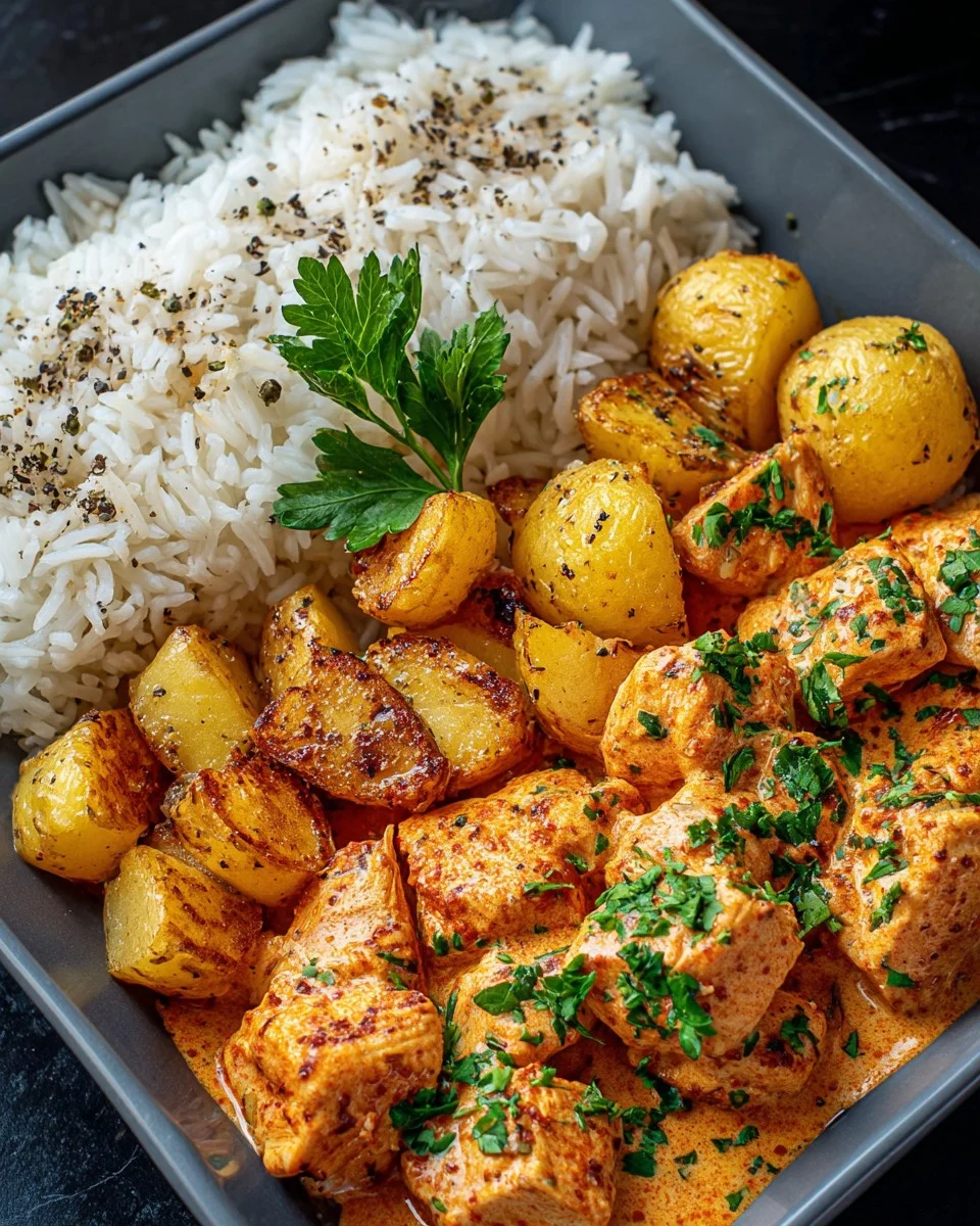 Ultimate Creamy Chicken with Roasted Potatoes & Fluffy Basmati Rice