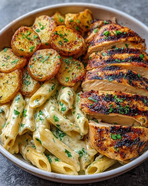 Ultimate Creamy Garlic Herb Pasta with Juicy Grilled Chicken & Crispy Golden Potatoes